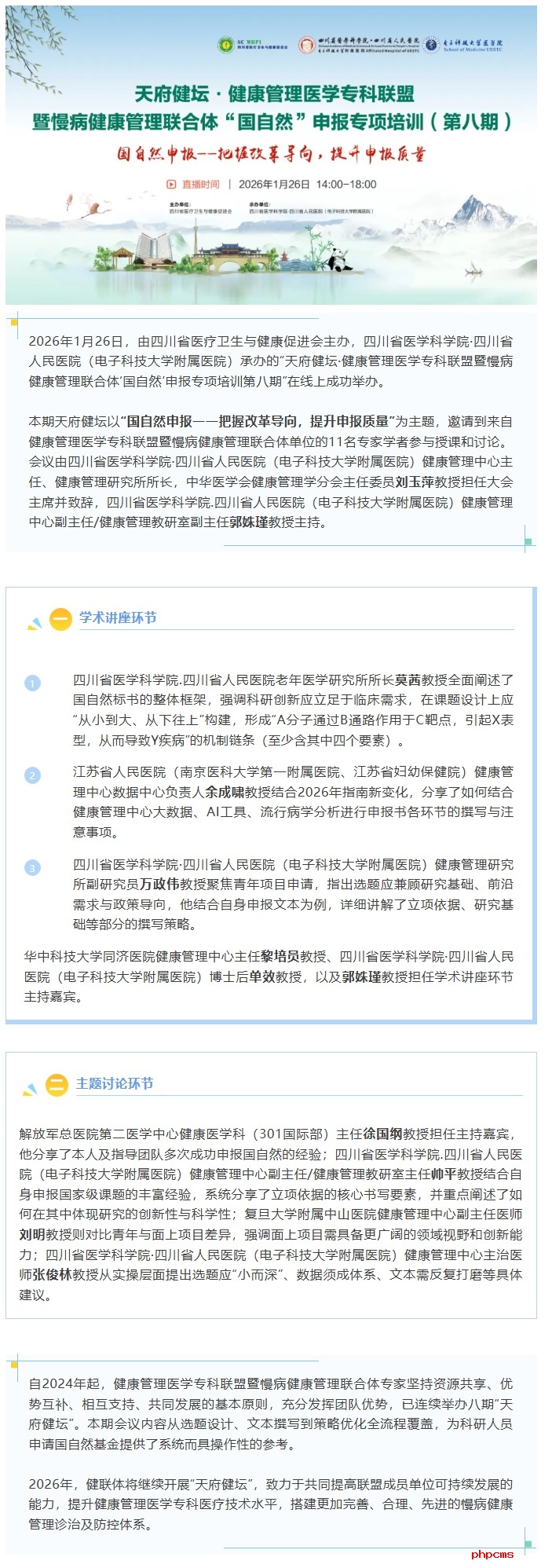 >体检中心 > 中心新闻>天府健坛·健康管理医学专科联盟暨慢病健康管理联合体“国自然”申报专项培训(第八期)成功举办