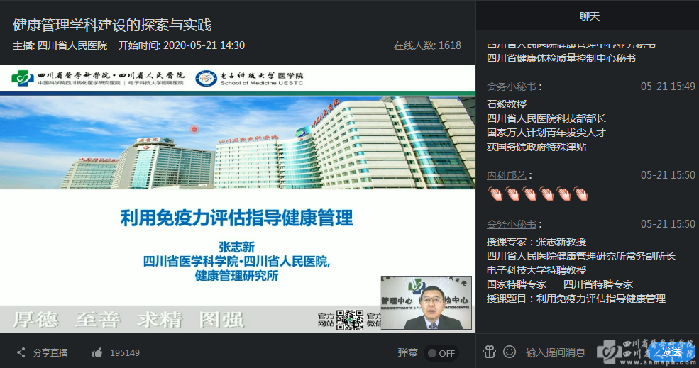 2020年5月21日14:30-17:20,由电子科技大学附属医院·四川省人民医院健康管理中心,电子科技大学附属医院·四川省人民医院健康管理研究所主办的健康管理学科建设的探索与实践线上论坛顺利召开。