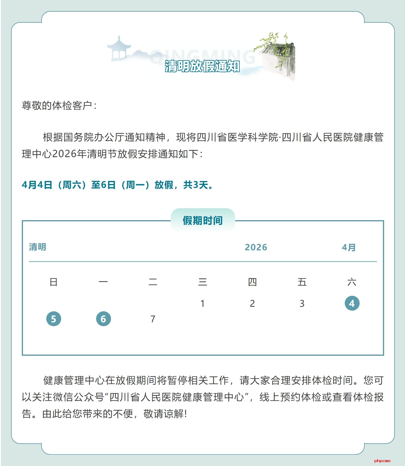 >体检中心 > 中心公告>健康管理中心2026年清明节放假通知